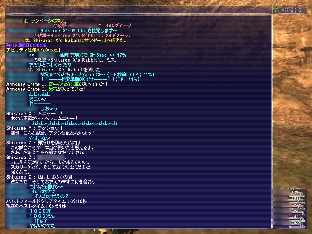 Xを落とした後はZに。TPリジェネ凶悪。ペンタ、スキュア、インパルス等、多段が多いので蝉をはがされまくり。カット装備と暗闇の術でなんとか。